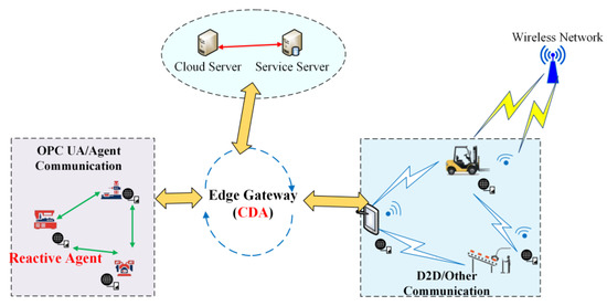 As aforementioned in Figure 4, the CDA such as the production agent plays the role of an intelligent gateway that integrates the performance of protocol, application, and safety. One primary functionality of the gateway is to translate data using diverse communication protocols, data formats, or languages. Since the CDA in the proposed framework interconnects with the IoT and can access the global cloud server, the communication between networks can be characterized via edge gateways. The edge gateways are deployed in the edge network communication, which is shown in Figure 6.