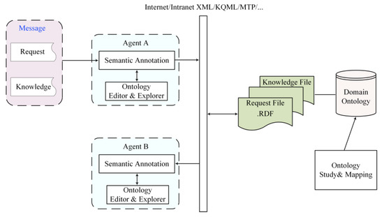 Virtually, communication between function domains is the communication between agents. There are commonly three kinds of communication modes between individual agents: a message-based mode, an event-based mode, a signal-based mode. Here, the message-based mode for the illustration of agents’ communication is chosen due to its intuitive feature. Under this mode, messages in MAS can be transmitted through an ontology model to achieve excellent compatibility and feasibility. Recently, ontology technology has been prevailing in the representation of a set of concepts and their relation in specific domains. Among most ontology languages such as the resource description framework (RDF), DARPA agent markup language + ontology interchange language (DMAL + OIL), extensible markup language (XML), simple HTML ontology extensions (SHOE), and web ontology Langauge (OWL), XML was verified to have great advantages regarding the readability and exchange of information. It is the semantic markup language that was designed as the vocabulary extension of the resource description framework (RDF), which provides more modeling primitive constructors and possesses clearer and more formal semantics [38]. In this study, XML is adopted as the ontology to describe the communication between individual agents. That is, different types and formats of messages will be transformed into XML representation through the semantic annotation firstly. The annotated message in the agent can be processed through the editor and explorer module. At last, an output message in a formatted document depicted by RDF is created, and other agents can recognize it. Figure 7 illustrates the XML and RDF-based message transmission procedure between two agents.