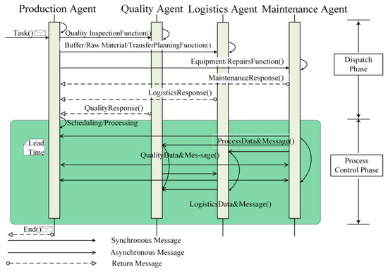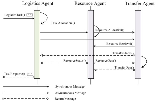 The relationship between individual agents in a dedicated function domain is mainly collaborative, such as that between the monitor agent and repairs agent in the maintenance domain (please see Figure 3). The collaboration behaviors within a function domain emphasize that the domain has a unifying overall goal and is generally applicable to situations where the targets and intentions of each agent are consistent. Multi-agent collaboration can extend the application fields and improve the performance of individual agents and the overall flexibility of the system. Figure 9 shows an example of collaboration protocol in the logistics domain. It is worth mentioning that “collaboration” distinguishes from “cooperation” through the action definition of individual agents. Even though the CDAs in the upper hierarchy are granted a specific role to manage the subagents, they are still harmonized by the production agent. Therefore, such CDAs participate both in “collaboration” and “cooperation” activities.