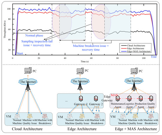 In this section, a network simulation software eNSP® (open source) is applied to construct a virtual production system containing 20 virtual machines as infrastructures, four gateways as edge computing actuators, one wireless access as cloud connectivity, and one PC terminal as the central processing unit. Table 1 lists the basic events that occur in manufacturing, where data packages and messages are transmitted through networks that interconnect the global system. The network transceivers are organized through triggering the events in intensive intervals. Recovery activities denote the event-handling procedures where multi-agents collaborate to resolve the predicament that occurred. The event-handling procedure consumes a huge amount of bandwidth due to the multirole coordination across different function domains. In the simulation, three architectures are tested. They are cloud architecture, edge architecture without MAS, and edge + MAS architecture. Figure 10 demonstrates the simulation results. The X and Y coordinates specify the time and average throughput of the networks, respectively. As can be seen in Figure 10, at the beginning of the production, the overall throughput proliferated until reaching the normal production state. This indicator is impacted after triggering the abnormal events. Especially when the network suffers from sampling inspection failure and machine breakdown issues asynchronously (overlap area), the throughput capacity of the two edge-based architectures exhibit better tenacities. The results show that the two edge architectures have overcome the cloud architecture in offloading data processing. Compared with cloud-based architecture, the average throughput has been improved by more than 50% when applying the edge architectures. This could be attributed to the distributed characteristics of edge computing. On the other hand, among two edge architectures, the proposed edge + MAS architecture has also shown superiority over the normal one. The phenomenon can be attributed to the efficient autonomy provided by the MAS.