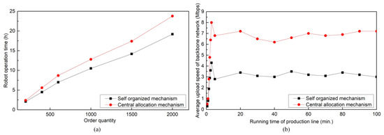 In the case study, the proposed self-organized mechanism is compared with the central handling processor, i.e., the central allocation mechanism. The estimation indicators are the robot operation time and the average upload speed of the backbone network speed. The results are shown in Figure 12. As can be seen from Figure 12a, with the increment of order quantity, the self-organized mechanism has shown more efficient characteristics than the central allocation mechanism. In Figure 12b, after the production line becomes stable, the upload speed of the backbone network based on the central allocation mechanism has reached 6–8 Mb/s. This value has been reduced by more than 50% by the self-organized mechanism. It indicates that the MAS with the competition resolution algorithm can schedule the tasks dynamically in an IoT-based environment. In the case study, Raspberry Pi is granted permission to implement the data fusion and information interaction with the production partners. Owning to the deployment of the edge network and MAS, the service delay is reduced, and the data transmission congestion is avoided.