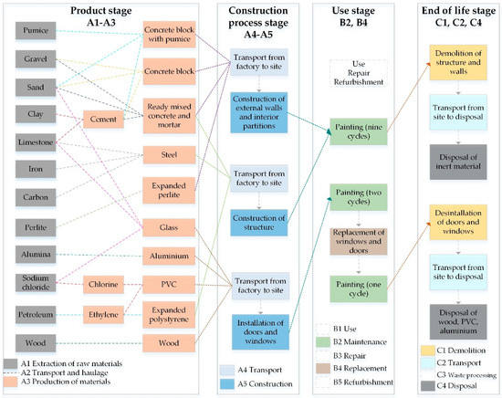 Previous research has dealt with the embodied impacts of a building (or its elements), studying different stages such as A1 to A4 [