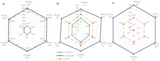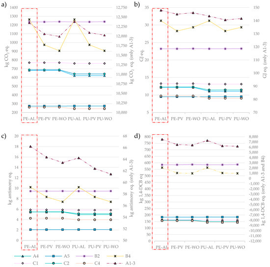Figure 8), it was seen that the least favorable option in all cases was that of the reference (PE-AL), which is more pronounced in the stages A1 to A3 and B4. Previous studies have found that the production of aluminum (stages A1 to A3 or B4) requires high energy consumption [