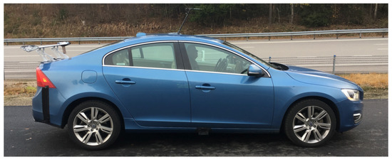 - Aeroprobe and pressure sensors (AP): The head wind condition plays an important role in the aerodynamics of the vehicle as a result it is important to track the head wind angles during the test. The aeroprobes have 7 ports at the tip measuring the respective pressures. These pressure values can later be used to calculate the slip angle, roll angle and angle of attack of the head wind. They have a range of and an accuracy of . The aeroprobe is placed over the roof of the test object at a vertical height of 360 mm from the roof, in line with Reference [17]. In the XY plane, it is placed in the intersection of the lines bisecting the wheelbase and track width. The disturbances created by cylindrical aeroprobe holder in the form of vortex shedding are minimized by using helical strakes. The pressure sensors are placed inside a small box on the roof in between the aeroprobe holder and the antenna with minimal interference to the flow.