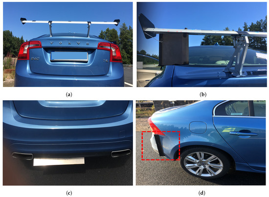 - Inverted Wing [w]: The wing is attached inverted, like on an aircraft, to the boot-lid of the vehicle, as shown in Figure 3a, in such a way that it generates more lift in the rear. The angle of attack of the wing is . Several test runs are done with tufts on the wing to adjust to the maximum possible angle of attack before stall. The behaviour of the tufts is viewed using cameras attached to the winglet.