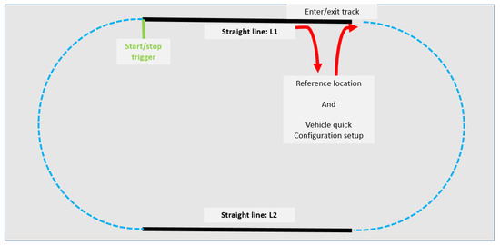 The tests are performed at the Volvo Cars Hällered Proving Ground. The test track used for this study is an oval track with two straight lines of 1.1 km, as sketched in Figure 4. Only measurements along the two straight lines are considered.