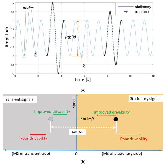 Differentiation of Stationary-Transient Signal [24]: (a) A signal divided into segments, where Peak-to-Peak distance is marked and the dotted line segments are sorted as transient. (b) Simple representation of how to read the ride diagrams. Left side represents Mean Squared Value (MS) of transient part and right side represents Mean Squared Value (MS) of stationary part.