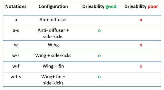 - Side-kicks [s]: Side-kicks are additional aerodynamic devices shaped as separation edges on both sides of the rear bumper, as shown in Figure 3d. They also have a slight spike to create an outwash while separating the flow at the defined locations. The objective of the side-kicks is to repair the negative effects induced by the three configurations, i.e, wing [w], wing with fin [w-f] and anti-diffuser [a].