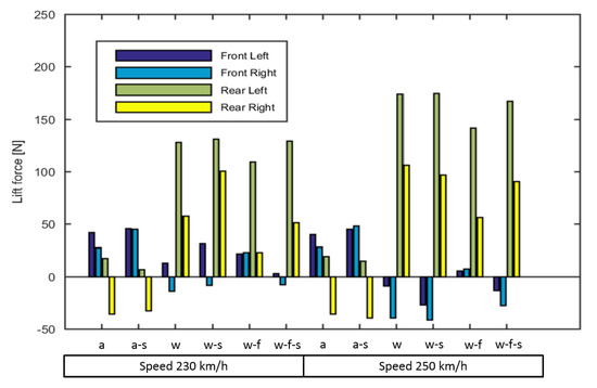 Wire displacement sensors are used to determine the lift forces of all the configurations which are compared with the reference test object, that is, the test object without any configurations. The RMS of the change in lift forces on each wheel for each configuration compared to the reference test object is shown in Figure 7. It is interesting to observe that the configuration with anti-diffuser (a and a-s) creates less lift distribution on rear right wheel compared to the reference. The rear right suspension receives a lower lift force where the anti-diffuser is not restricting the flow along the diffuser and the rear left has higher lift where the anti-diffuser restricts the flow along the diffuser. The configurations with anti-diffuser provide the lowest lift forces of all the configurations independent of speed. For the wing (w and w-s) and wing with fin (w-f and w-f-s) configurations, the increase in speed from 230 to 250 km/h results in higher rear lift. As a result the load is being redistributed more to the front of the test object. This causes the front suspension to compress and the test object to pitch down. When comparing the configuration pairs in Figure 7, it is hard to make any conclusive statement on the side-kicks’ contribution to lift. The asymmetric suspension expansion between rear left and right is also notable in this bar graph. This could be due to a difference in unsprung weight.