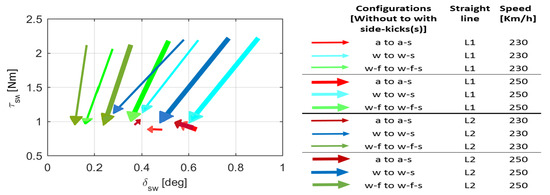 The standard deviation comparison is of major interest as it shows unsteady behaviours of a vehicle. The vector plots in Figure 9 show the change in standard deviation for all configurations with and without side-kicks. The configuration pair with anti-diffuser (a to a-s) shows a notable behaviour change between with and without side-kicks, unlike in the mean vector plots. This suggests that side-kicks dampen the unsteady vehicle behaviour resulting in better driving on a straight line. Similar behaviour is seen in the configurations with wing and wing with fin. It is interesting to note that in Figure 9 the configuration with anti-diffuser at 250 km/h have only steering torque improvement with side-kicks at straight line L1. Similarly, the wing with fin configuration (w-f to w-f-s) has no influences with respect to vehicle response, i.e, lateral acceleration and yaw velocity at 250 km/h. However, in general the vector plot pattern of configurations without side-kicks to with side-kicks is towards the origin of the graph, showing a reduction in magnitude of all the variables investigated. This is inline with the subjective judgement of an improved drivability.