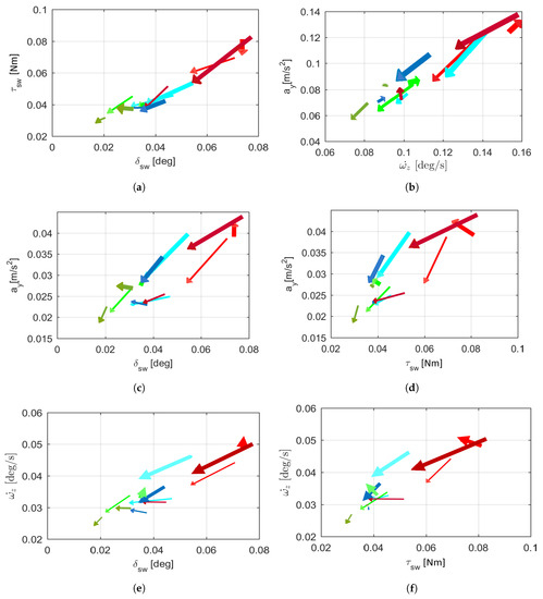 Standard deviation vector plots of each straight line L1 & L2 for the different configurations and speeds: (a) Steering torque vs steering angle . (b) Lateral acceleration vs yaw velocity . (c) Lateral acceleration vs steering angle . (d) Lateral acceleration vs steering torque . (e) Yaw velocity vs steering angle . (f) Yaw velocity vs steering torque . Legend same as Figure 8.