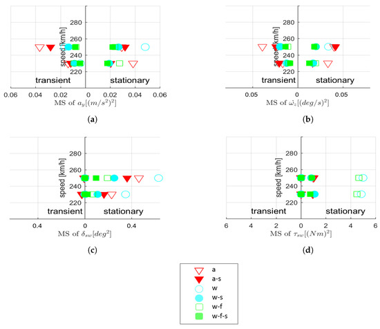Figure 10 shows ride diagrams of all configurations using all four variables considered. The graph plots the MS values of the transient part of the signal to the left and the MS values of remaining (stationary) signals to the right. Unfilled markers represent respective configurations without side-kicks and filled markers represent configurations with side-kicks. The sum of MS values of transient and stationary gives the total MS value of the signal. Figure 10a,b show that the contribution of transient nature is larger in the configuration with anti-diffuser compared to other configurations. The steering characteristics, as seen in Figure 10c,d show a larger contribution on the stationary side, especially for wing and wing with fin configurations and the transient contribution is negligible in comparison. This shows the inability to respond to unknown transient behaviours. This is clearer while comparing the steering characteristic, , of all the configurations in Figure 10d where the wing and wing with fin configurations have significant difference between with side-kicks and without side-kicks. Figure 10 showing the simple representation of how the ride diagram is looked into, portraits that the further the MS value is from the origin on the x axis, the lower the standard of drivabilty. The ride diagrams interpreted this way agree with subjective judgement of all configurations.