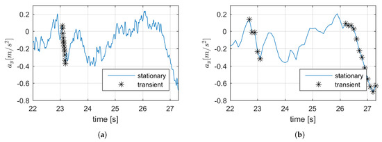Comparison of the ability to separate transient segments in different sample rates: (a) Lateral acceleration vs time with a sample rate of Hz. (b) Lateral acceleration vs time after downsampling to Hz.