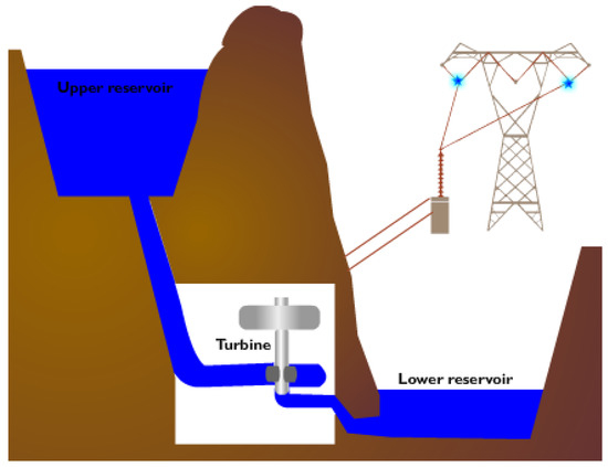 Water is stored in the upper tank. During generation mode this water will flow through the hydropower plant to generate electricity. For storage, the used water is pumped from the lower tank into the upper tank using the same reversible turbines. It is noted that some use abandoned mines for lower reservoirs as the height difference between two storage tanks is of paramount importance to generate more mechanical energy [13,14].