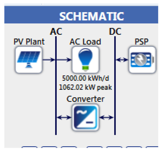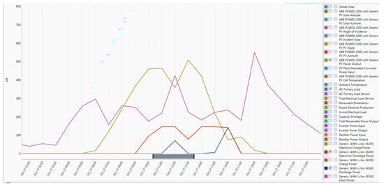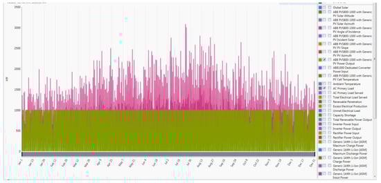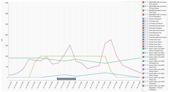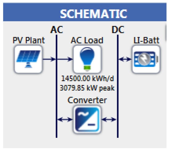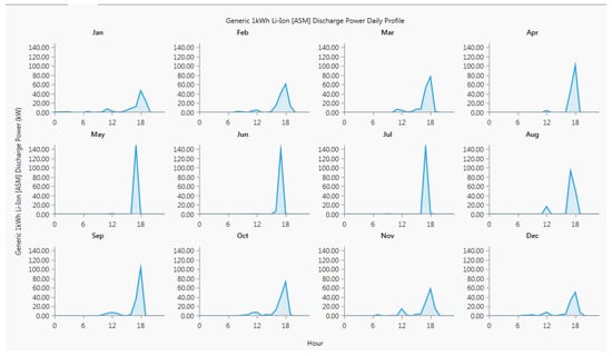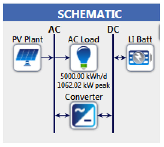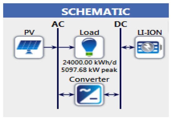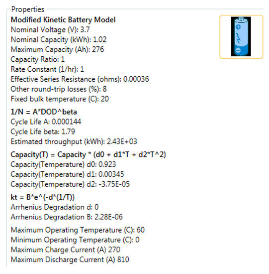 The peak load was 5 MWh, and merely 20% of the load, which was just 1 MWh, had to be stored in Li-Ion batteries. Figure 4 shows the schematic diagram of case study 1. The properties of the storage batteries are provided below in Figure 5. A total of 1000 batteries were required to make 1 MWh storage.