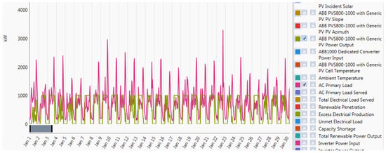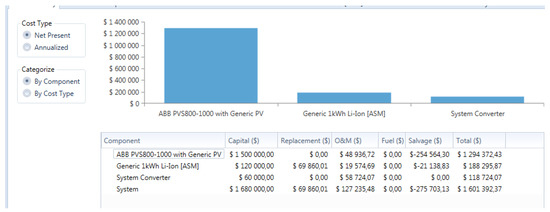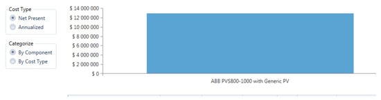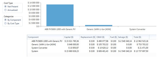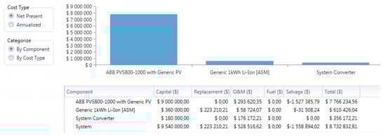 Figure 9 Where the system had a battery storage facility, the PV output behaved the same. The difference came about at 8 am where there was sudden peak loading until 11 am, then storage power could be discharged from batteries to supplement the PV and the same occurred again from 13:00 to 18:00. For example at 18:00, 218 kW could be drawn from batteries when the load was at peak and PV was dropping. Normally, when load drops occur, then PV is used to charge the batteries. Figure 10 shows the 5 MW PV plant net present cost without storage using ABB PSV800-1000 solar panels.