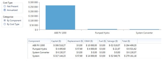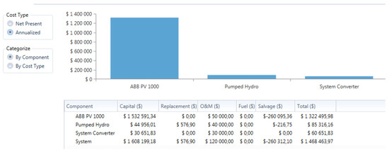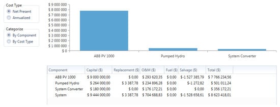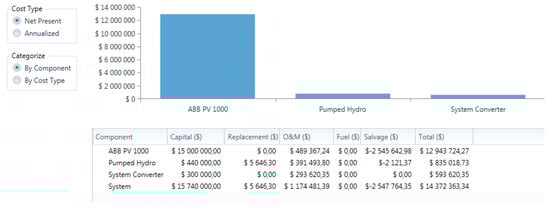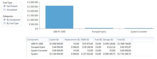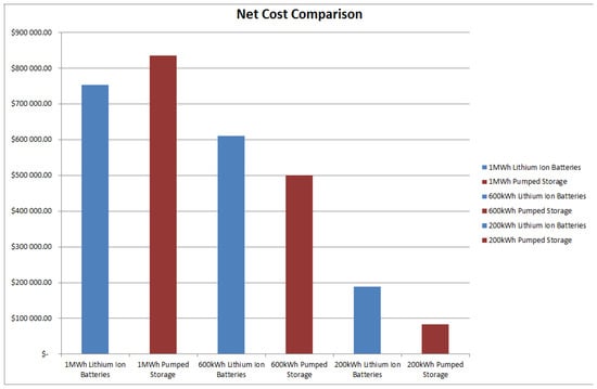 Using pumped storage to supplement the load and rectify the PV also worked as did battery storage; the cost associated with the system at only 20% of storage capacity is just USD 2.7 million as shown in Figure 41. PPS storage cost is higher than when using the batteries on the same system as displayed in Figure 41 and Figure 42. The difference between the two systems is reported in Table 5 below. Based on the cost results, the sole system that can be chosen for the 1 MW plan is storage batteries.
