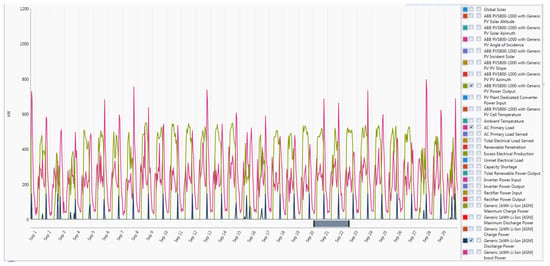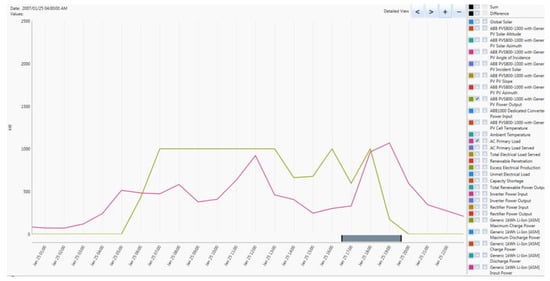 Continuing from Figure 6, now the storage battery bank is introduced in the system and that is shown in Figure 9. PV power output is drawn as the green graph and load is the purple one. In Figure 6; where there is no storage facility on the system, PV output starts increasing from 5 am and peaks at 7 am. From there the output is smooth; it is up and down depending on the irradiation on the day. This output started dropping at 18:00 because it depends solely on the sun. From 19:00 little power can be supplied and there will be no power by 20:00. The simulations and results were based on Cape Town times, which are different from other areas because it has longer sun day by nature.