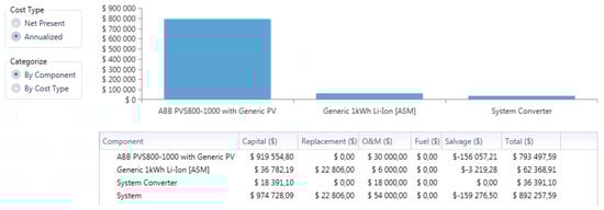 Factors considered and applied during the cost evaluation are stated. The location data such as irradiation, geographical location and temperature were determined using Solaris software (PVplanner) to plot the ideal location for base PV plant. The data obtained was inputted into the Homer Pro® program. To develop the economical solution using HomerPro® software, the following information was required and inputted: geographical location, meteorological data, hourly/daily/monthly load profiles which the PV system will feed, life span of the system, carbon emissions if any including cost of penalties, cost of each equipment in the system as well as the capital, operation and maintenance. For the cost of each equipment, HomerPro® default and updated values in USD were used. Once all the data is captured, the search space is also used to find the optimal solution for the required load based on the cheapest system analysis to optimise the system behaviour and output. The ultimate solution will then be presented. From [40,41], the levelised costs of energy (COE), annualised cost (Cann) and net present cost (NPC) were determined for each system using below respective formulas/equations; levelised cost:
