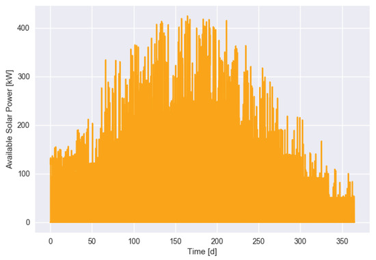 Our test system was a medium-sized company with EVs, charging stations, and a photovoltaic (PV) system with a peak power of kW (for the output of the PV system over a year, see Figure 1). The rest of the facility was not modeled in detail. Charging stations and EVs have different maximum charging power between 10 kW and 150 kW.