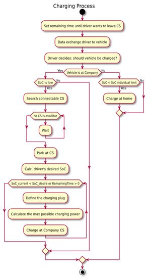 This means that there were both variations in the average values between users, as well as daily variations. Note that in addition to charging demands, weather conditions will differ, so that typical CSI values will vary over different days. The process for computing the daily charging demands is depicted in Figure 2. As one can see, it is also part of the user behavior that the vehicle can also be loaded externally to the company and that the user has to wait when there are not enough free charging stations. This also has an effect on and the CSI calculation.