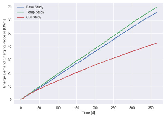 Looking at the impact of different scenarios on the total charged energy in Figure 5, we observed a small increase in the temperature-dependent usage scenario and a strong decline to about 65% of the base demand for the CSI scenario.