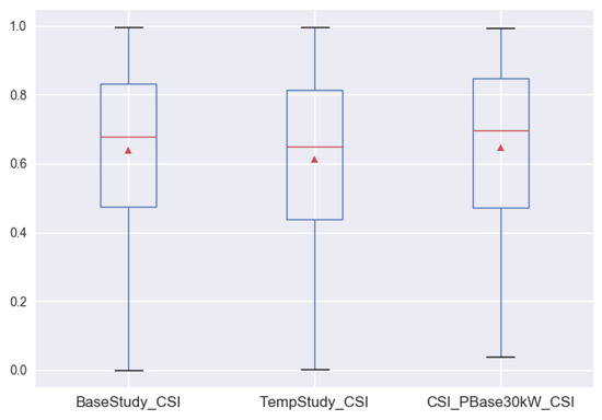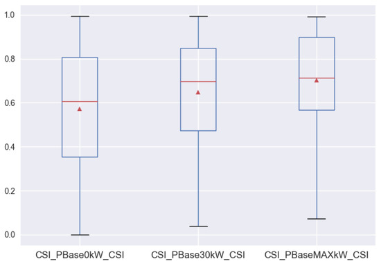 A boxplot of CSI values for all three scenarios is shown in Figure 9. Note that this plot only shows charging processes with a CSI of <1.0. In fact, 93–98% (depending on scenario) of all charging processes provide full customer satisfaction. Differences for the three scenarios were very small, with the CSI scenario even having the best average values and the Temp scenario the worst values. The changes for the CSI scenario when adapting are shown in Figure 10. We note an increase in CSI values with more base charging power (taken from the grid). However, due to limited charging power, customer satisfaction might still be suboptimal even when a very large grid supply is available.