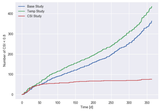 Accumulated number of low (<0.8) CSI charging processes in the CSI-sensitive scenario for different values.