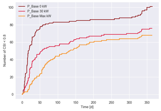 Accumulated number of low (<0.8) CSI charging processes for different scenarios (with kW).