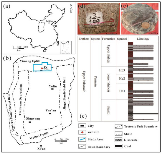 (a) Scope of Ordos Basin in China; (b) location of Hangjinqi area in Ordos Basin; (c) stratigraphic sequence; (d) glutenite in the He3 member of the JX well, depth 3047.65–3047.77 m; (e) glutenite in the He3 member of the JX well, depth 3053.42–3053.68 m.