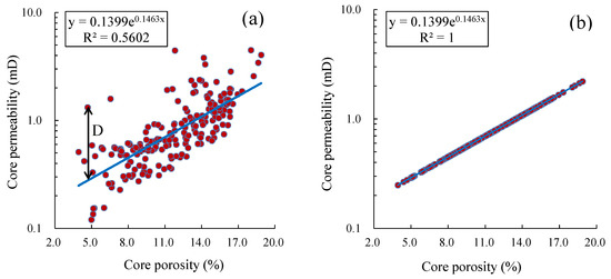 Equation (1) is exponential but the correlation is only 0.5602. In Figure 2a, this exponential line can be regarded as a mainstream empirical relationship trend that solves the permeability by porosity in the He3 member reservoir of the study area.