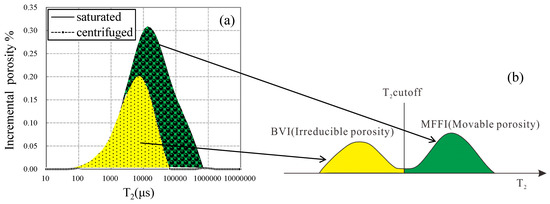 (a) The NMR T2 distributions for sample No. 1, and (b) movable (green area) and irreducible (yellow area) porosity of sample No. 1.