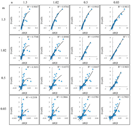 where Ks is the permeability calculated by Equation (1). The key factor for the establishment of Equation (7) is to find the appropriate m and n values. It can be obtained by fitting analysis of ΔRQI and D.