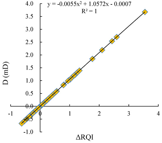 The cross-plot between D and ΔRQI. The highest polynomial correlation coefficient is 1 when m is 1.02 and n is 0.03.