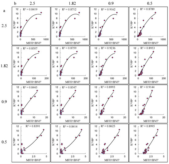 - Regression analysis using the independent and dependent variables of Equation (8), when the optimized m and n values remain constant. The initial values of a and b are given arbitrarily, with the a and b values changing, the optimum a and b values are determined when the correlation coefficient of the power function is the highest.