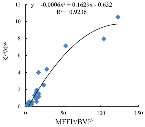 Keeping m at 1.02 and n at 0.03, regression analysis was carried out with the independent and dependent variables of Equation (8). The data involved in the regression analysis were derived from the helium porosity, helium permeability, movable pore volume, and irreducible pore volume in Table 1. Figure 6 shows the partial polynomial statistical results. When the highest correlation coefficient of polynomial regression analysis is 0.9236, the optimal value a is 1.82 and b is 0.9. As shown in Figure 7, the Equation (8) can be expressed as: