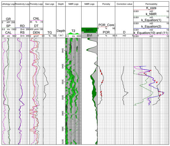 In the upper part of the reservoir at 3045–3051 m, the permeability value obtained from Equation (1) is larger than the lower part of the reservoir in Track 10, because the permeability calculated by Equation (1) varies with porosity, as it monotonically increases or decreases. The permeability values calculated by the NMR logs are lower than these core samples. There are two main factors; the first is that NMR logs can effectively identify pore structure. In Track 7, the upper part of the reservoir is high in total porosity but mainly due to the larger bulk volume irreducible, which affects the permeability of the reservoir [32,33,34,35]. The second is that the permeability obtained by NMR logs is affected by reservoir gas content [36,37,38], and the calculated permeability decreases with the increase of the gas content in the reservoir. The total hydrocarbon curve of gas logs is shown in Track 4. It is derived from mud logging data and represents the true gas content in the reservoir. The total hydrocarbon curve indicates that the gas content in the upper part of the reservoir is larger than that the lower part, and the maximum gas content is 38.5%. Therefore, the permeability value calculated by NMR logs in the upper part of the reservoir is more affected by the gas content than the lower part. The permeability calculated by Equation (2) is closer to the core sample, but it is reduced by the influence of reservoir gas bearing property.