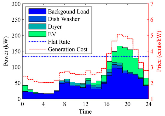 No schedule load actions were taken, and a flat electricity rate was applied in this case. Figure 2 shows the simulation results. The load profile was simulated by the residential load forecast model. The red dash line shows the generation cost with load and the blue dash-dot line shows the equivalent flat electricity rate assuming a budget-balanced market. The consumed electrical energy was 1716.9 kWh, and the electrical energy cost in the day was calculated as $62.77 based on the generation cost. To keep the budget balanced, the equivalent flat rate is calculated as follows: $62.77/1716.9 kWh = 3.66 ¢/kWh.