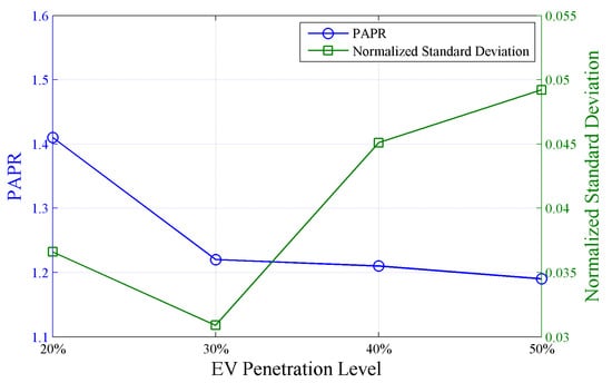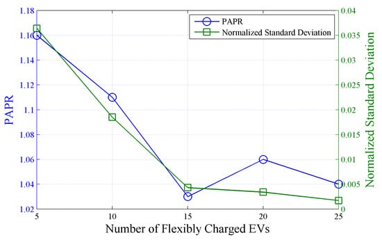 The PAPR and the normalized standard deviation of the load profile with a different number of flexibly charged EVs at a 50% EV penetration level.