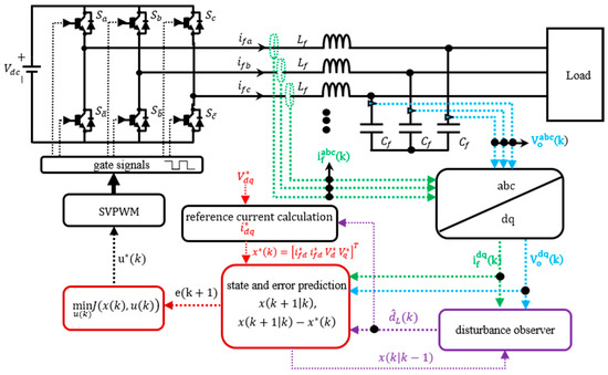 Figure 4 shows the general block diagram of the controlled system. The currents and output voltages are measured then converted to the d-q reference frame using Park transformation. The disturbance observer (15) estimates , and the estimated disturbance vector, is sent to the prediction and reference blocks. The error prediction (38) is then performed, and the optimal control input (48) is calculated and send to the SVPWM modulator.