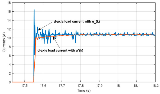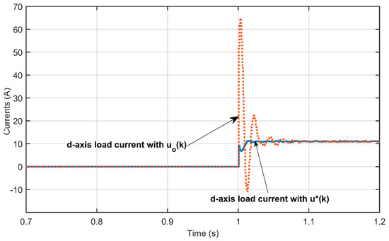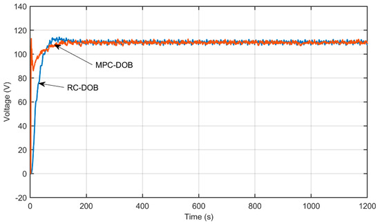 The robustness of the proposed method was evaluated for different filter and nonlinear load parameters , , , ). The capacitance of the filter was changed as , and the same inductance value was used . The nominal filter parameters () were used in the computation of the values to evaluate the robustness of the proposed method under parameter change. Figure 16 shows that MPC-DOB and RC-DOB are robust against parameter change, and the transient response is faster with MP-DOB. RC-LOB was not included in the comparison, since it could not stabilize the system under the selected parameters. In Figure 14, Figure 15 and Figure 16, we can see that MPC-DOB shows faster tracking performance than RC-DOB. The better tracking performance of MPC-DOB comes from minimizing the cost index of Equation (40), which penalizes the predicted tracking error.