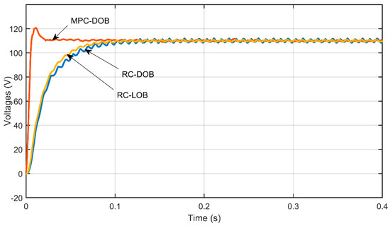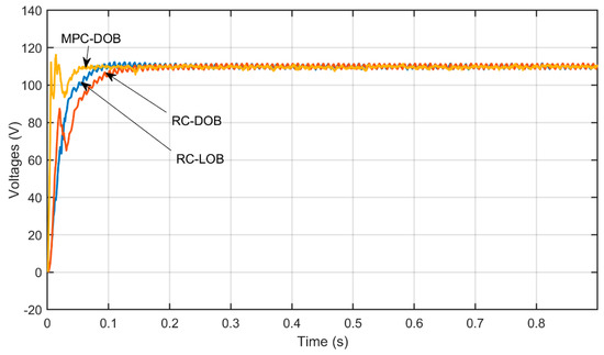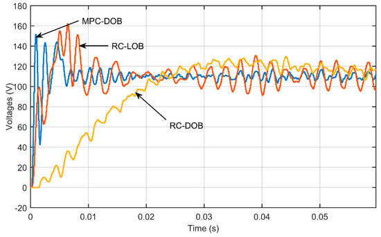 The transient response of the controllers was evaluated for the inductive and nonlinear loads, as seen in Figure 14 and Figure 15, respectively. For a fair comparison, was chosen as 7.5 for RC-DOB and RC-LOB and 7.8 for MPC-DOB based on the small THD values (chosen design parameters from Table 3, Table 4, Table 5 and Table 6). For the inductive load, , . and for the nonlinear load, were chosen. MPC-DOB provided a faster transient response in both load cases compared to the other two control methods. The simulation result given in Figure 7 showed a similar response with Figure 15.