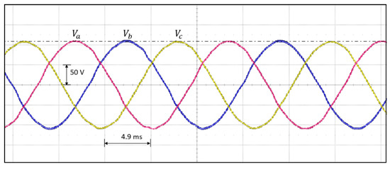 The steady state response of the three-phase output voltages with MPC-DOB under the resistive load (η = 7.8, , ).