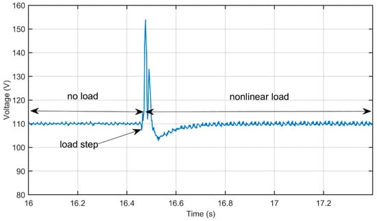 Transient response of the d-axis output voltage with MPC-DOB from no load to nonlinear load step (THD = 3.1%, η = 7.8).