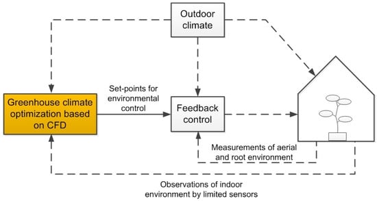 Generally, the greenhouse climate management can be resolved into two dynamic processes: slow crop growth dynamics and relatively fast greenhouse climate dynamics [,]. For fast climate dynamics, the set-points of the greenhouse environmental variables such as air temperature, humidity and concentration, should be decided in advance by the grower or computer systems. Once these set-points are decided, the desired climate in the greenhouse can be achieved by proportional–integral (PI) or other classic feed-back control methods. However, these set-points are usually time-varying and spatially distributed. In recent years, many optimal control schemes have been reported for such greenhouse climate control problems [,,]. The environmental parameters’ spatial feature is seldom mentioned, which is important for crop growth and energy saving in large and medium-sized greenhouse. Figure 1 describes the basic block diagram of the climate control procedure and the highlighted optimization part is the focus of this study.