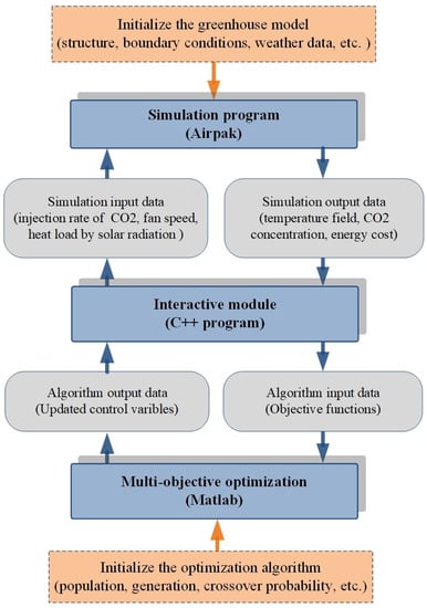 Considering the spatial influences of environmental parameters, CFD simulation is the most accurate way of modeling. Taking advantage of the current high-speed development of computing technology, hybrid simulation–optimization has been widely used in the field of building enclosure optimal design and operation. Combined with previous reported interactive optimization methods [,,], we propose a set of greenhouse environment optimization solutions.