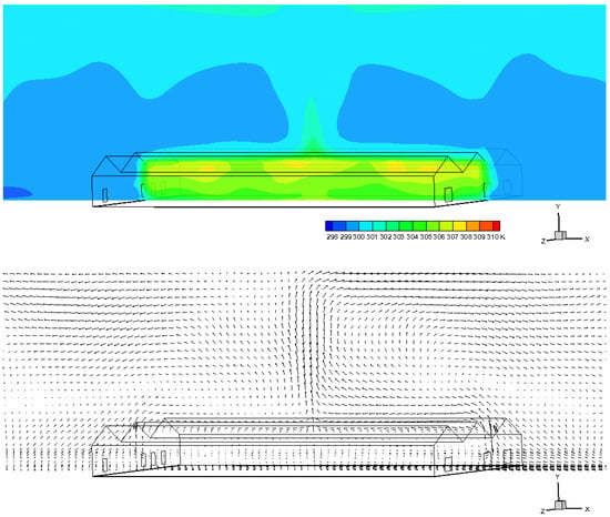 Figure 5 provides steady temperature contour and airflow vector field at one vertical section facing the window and fan. From the figure, it is seen that indoor temperature and airflow are not evenly distributed. The assumption of “well mixed” does not exactly fit into the real situation, which was also reported by many previous literature [,,]. Concretely, at noon during a warm day (May in east China), the temperature in the upper part of the greenhouse was generally higher than the temperature in the lower area because of the outdoor heat radiation through the sunshine-plate roof. The temperature near the natural ventilation windows was lower than the temperature of middle area because the average temperature inside the greenhouse was higher than outside at noon. Because of the negative pressure ventilation by three fans, the lower air flows faster than the upper part.
