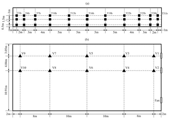 There were 33 temperature sensors () forming a measurement matrix in single vertical section from south to north (length direction × height direction: ). The section location was selected facing the middle fan (Z = 7.089 m). At each height, there were 11 temperature sensors uneven distributed: sparse in middle area, dense near boundaries. The side view of the 2D sensor matrix from east direction is provided in Figure 6a. Airflow patterns were also investigated by 20 observing points () at two vertical sections with two heights (: 0.7 m, : 1.6 m). The top view of the air velocity sensor matrix is provided in Figure 6b.