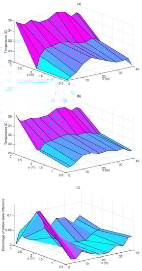 Results of 2D temperature measurements: (a) natural ventilation, (b) mechanical ventilation, (c) percentage of temperature difference between experiment and simulation.