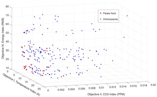 The results of the multi-objective optimization are shown in Figure 10. From a total of 243 chromosomes, 25 pairs of chromosomes of the last generation identified by the NSGA-II algorithm belong to the Pareto frontier. It is noted that seven chromosomes of total 250 are abandoned because of the CFD convergence issue. From the figure, we can find that the target sets represented by particles spread toward the optimal directions. Each particle performs differently with respect to the individual objective indexes. Concretely, among the best 25 solutions, the variation of the index of was [5.08, 20.90] (K), the variation of the index of was [0.0, 0.0055] (ppm), and the variation of the index of was [17.4, 59.9] (CNY).